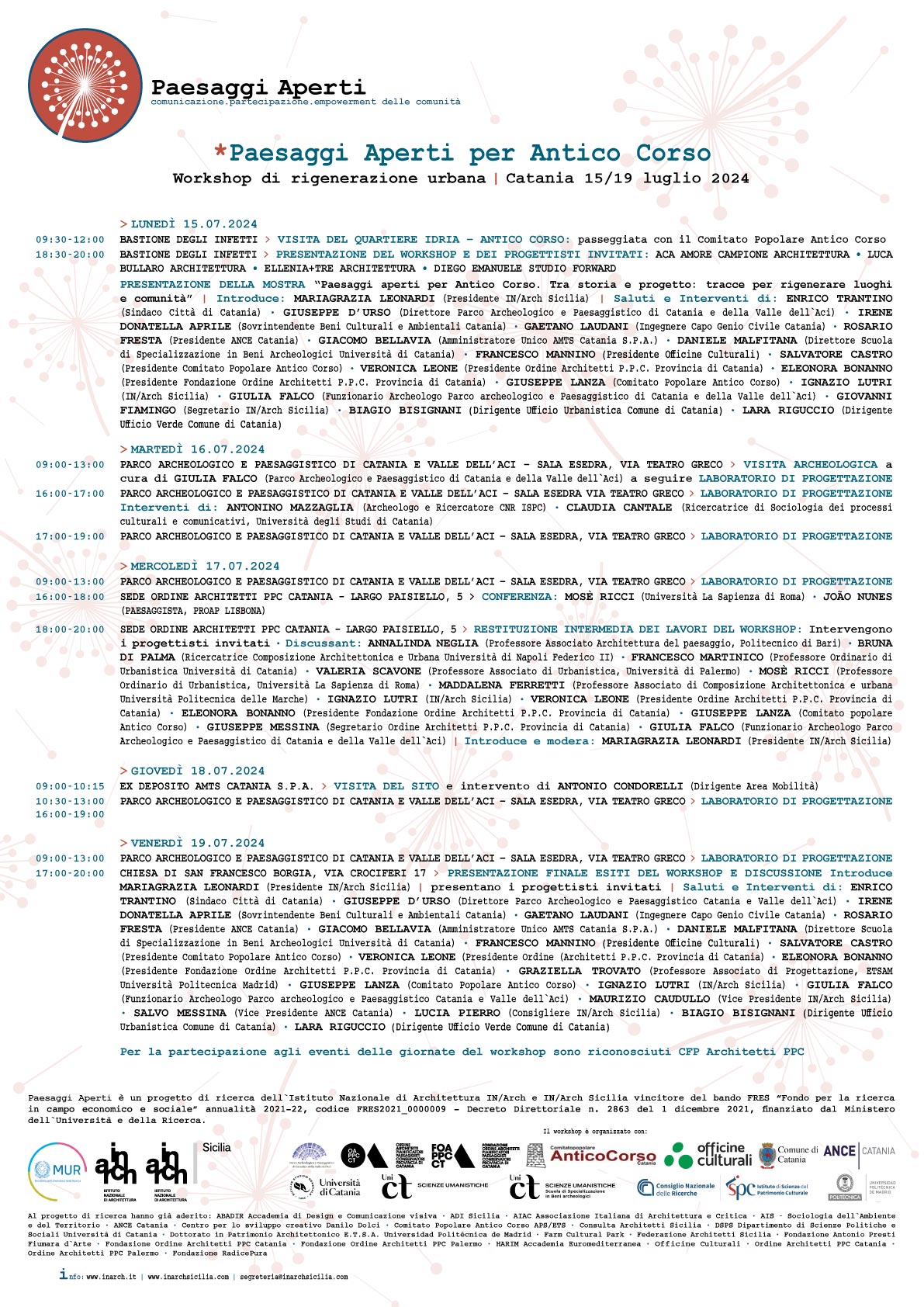 Si comincia il giorno 15 luglio 2024 alle ore 9:00 con la Visita del Quartiere Idria Antico Corso a cura del Comitato Popolare Antico Corso. Nel pomeriggio l’incontro pubblico sarà alle ore 18:00 al Bastione degli Infetti con l’apertura dei lavori e l’inaugurazione della Mostra PAESAGGI APERTI PER ANTICO CORSO. TRA STORIA E PROGETTO: TRACCE PER RIGENERARE LUOGHI E COMUNITÀ all’introduzione di MARIAGRAZIA LEONARDI (Presidente IN/Arch Sicilia) seguiranno gli interventi di: ENRICO TRANTINO (Sindaco Città di Catania); GIUSEPPE D’URSO (Direttore Parco Archeologico e Paesaggistico di Catania e della Valle dell’Aci); IRENE DONATELLA APRILE (Sovrintendente Beni Culturali e Ambientali Catania); GAETANO LAUDANI (Ingegnere Capo Genio Civile Catania); ROSARIO FRESTA (Presidente ANCE Catania); GIACOMO BELLAVIA (Amministratore Unico AMTS Catania S.P.A.); DANIELE MALFITANA (Direttore Scuola di Specializzazione in Beni Archeologici Università di Catania); FRANCESCO MANNINO (Presidente Officine Culturali); SALVATORE CASTRO (Presidente Comitato Popolare Antico Corso); VERONICA LEONE (Presidente Ordine Architetti P.P.C. Provincia di Catania); ELEONORA BONANNO (Presidente Fondazione Ordine Architetti P.P.C. Provincia di Catania); GIUSEPPE LANZA (Comitato Popolare Antico Corso); IGNAZIO LUTRI (IN/Arch Sicilia); GIULIA FALCO (Funzionario Archeologo Parco archeologico e Paesaggistico di Catania e della Valle dell’Aci); GIOVANNI FIAMINGO (Segretario IN/Arch Sicilia); BIAGIO BISIGNANI (Dirigente Ufficio Urbanistica Comune di Catania); LARA RIGUCCIO (Dirigente Ufficio Verde Comune di Catania) ed i progettisti invitati: ACA AMORE CAMPIONE ARCHITETTURA; LUCA BULLARO ARCHITETTURA, ELLENIA+TRE ARCHITETTURA e DIEGO EMANUELE (STUDIO FORWARD).